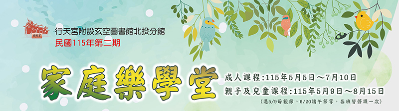 以品德教育為根基,秉承行天宮五倫八德之精神,以家庭樂學堂(Lohas Family)促進人際和諧,闔家和樂平安為宗旨,推廣「We Are Family」之家庭式概念的北投圖書館。以親近自然,生活園藝、體驗農作;促進手眼協調,律動、劇場、書法與藝術手作;覺察情緒、家庭醫學與健康等活動。讓您擁抱自然,釋放壓力、學習專注,感受內心穩定的力量,歡迎大小朋友報名參與。