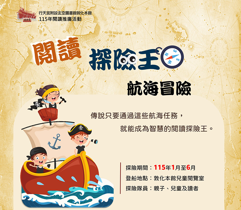 理想的書籍,是智慧的鑰匙。為實踐 關聖帝君傳世明訓「讀好書、說好話、行好事、做好人。」本系列以主題書展結合STEAM教育,設計「閱讀探險王~航海冒險」活動,強調跨領域整合、探究實作、解決問題,期以培養創新思維與批判思考的能力,營造閱讀力。